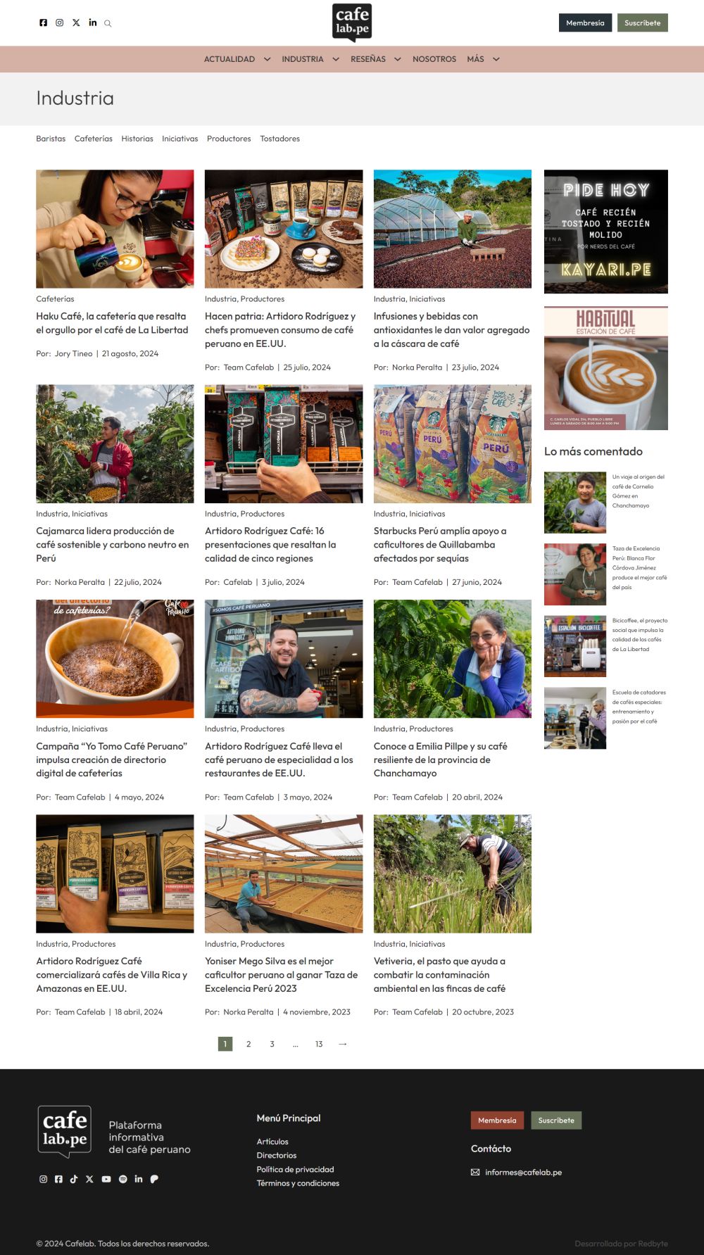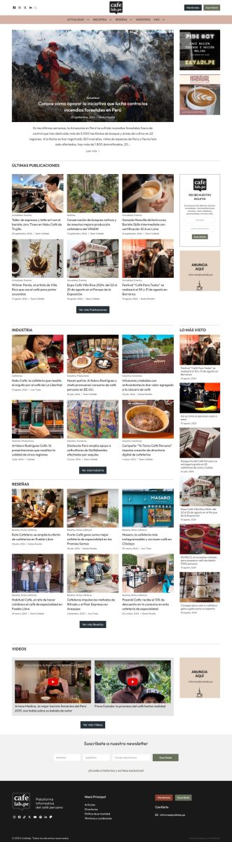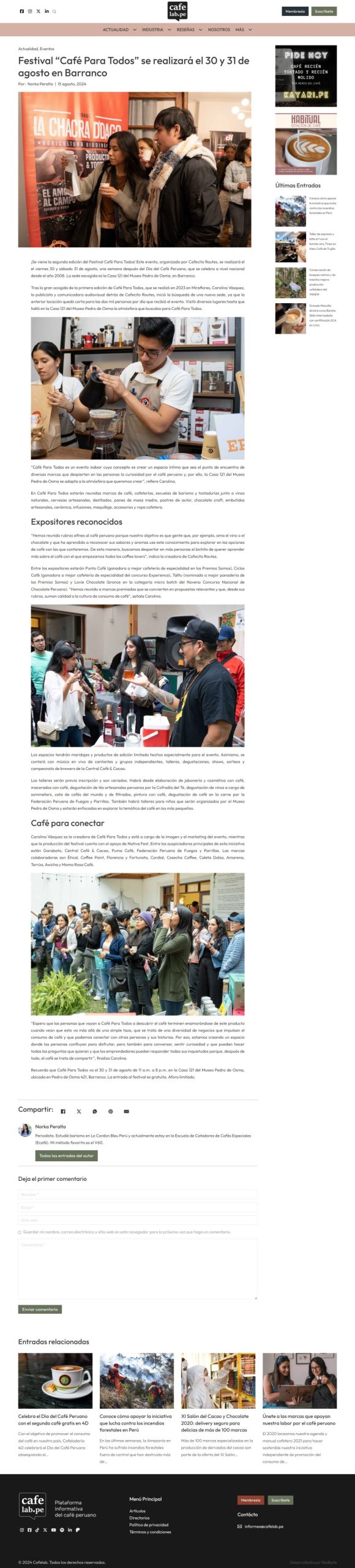 Cafelab.pe es la primera plataforma de noticias especializada en café en Perú. Desde 2017, esta en línea informando sobre las historias de vida y emprendimientos en torno al café producido bajo los criterios de Comercio Justo, equidad de género y sostenibilidad ambiental. Más de 200 mil familias de pequeños productores dependen de esta actividad que ha llevado al Perú a ser el primer país productor de café orgánico.