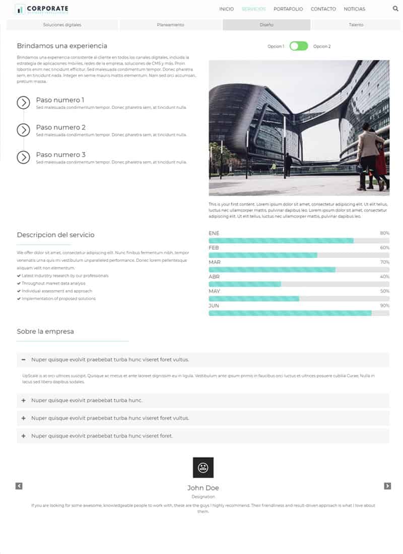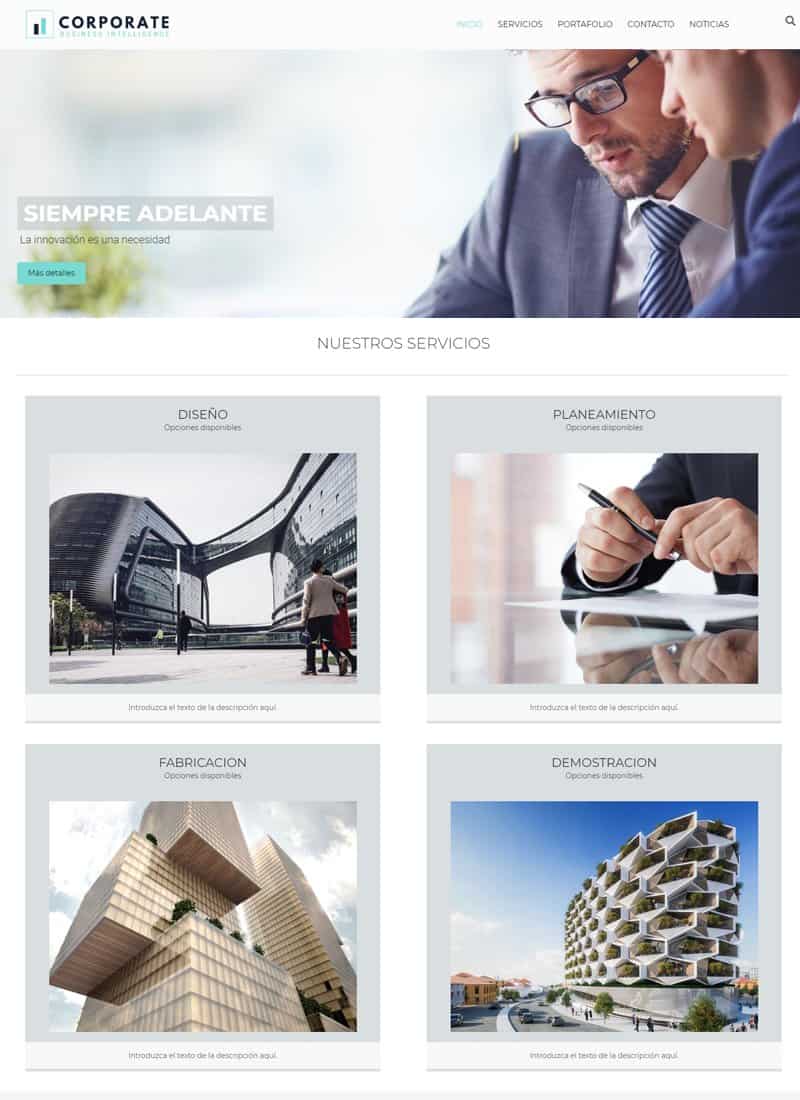 Explora nuestra pagina de una empresa que ofrece servicios corporativos. Se destacan los servicios y el portafolio de proyectos a fin de promocionar la imagen y solidez de la empresa. Se puede adicionar un sistema de soporte para atención al cliente que complemente la experiencia de una empresa con respaldo.