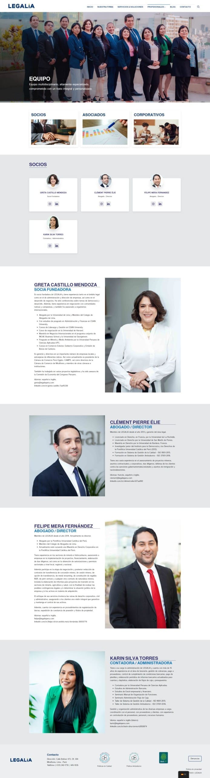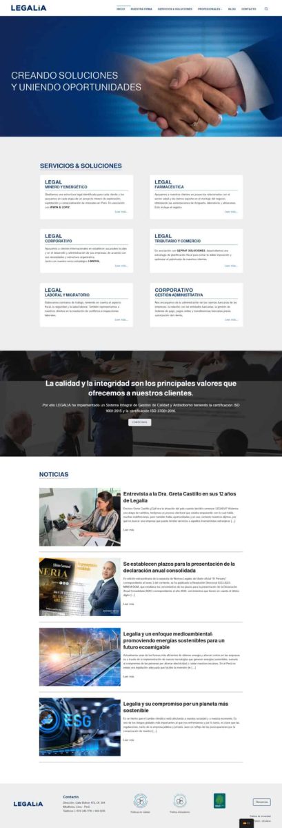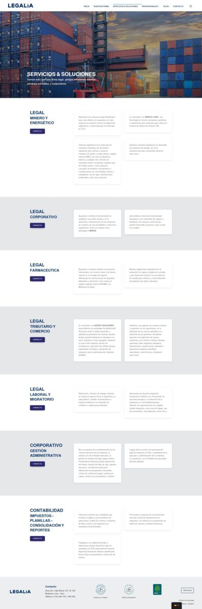 Es una firma especializada en asesoría legal y brinda también servicios contables y corporativos que facilitan el desarrollo de las actividades de sus clientes. Pagina web corporativa en 2 idiomas. Animaciones de entrada y sistema de blog.