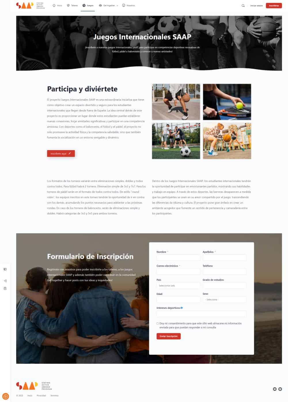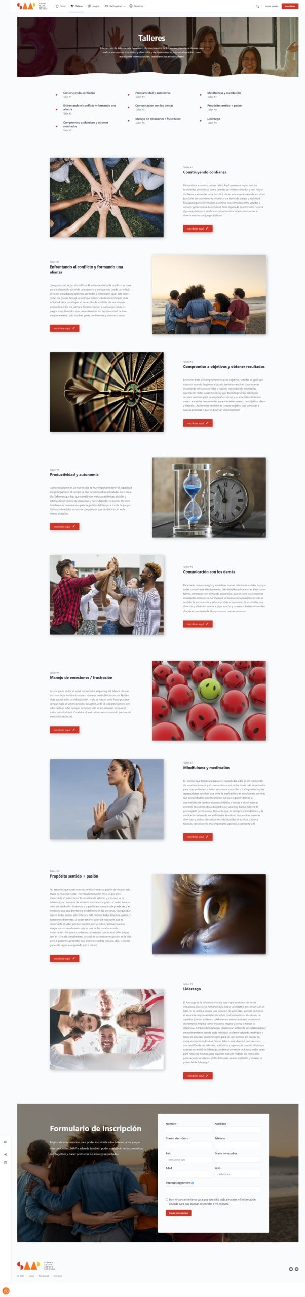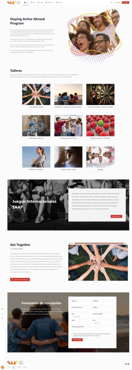 Staying Active Abroad Program. Nuestra misión es poder valorar el incremento del sentido de bienestar de los estudiantes universitarios que decidieron participar dentro de este proyecto mediante el deporte, la actividad física y talleres psicoeducativos, con la finalidad de fomentar las relaciones sociales entre estudiantes extranjeros y locales. Desarrollo de pagina web para una comunidad con miembros, mensajería interna, grupos, foros, talleres.